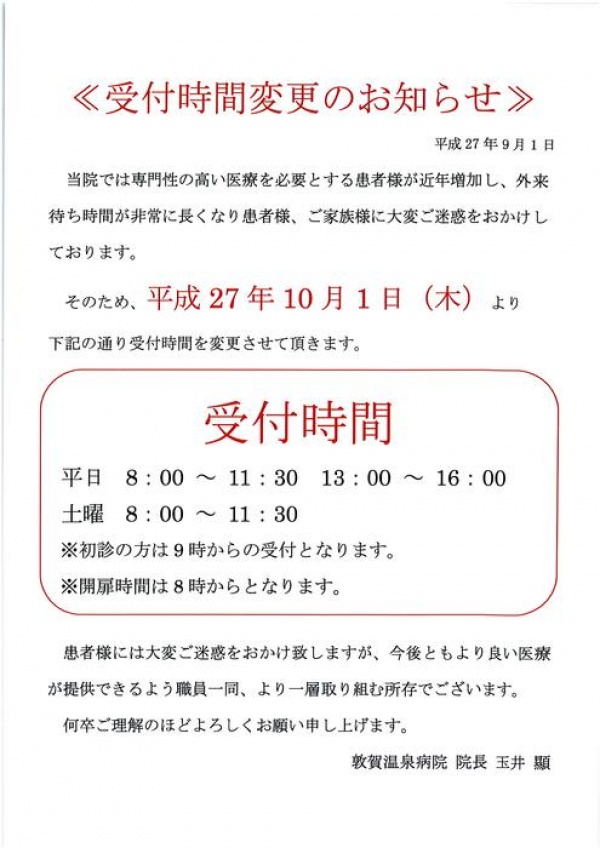 そのため、平成27年10月1日(木)より下記の通り受付時間を変更させて頂きます。